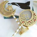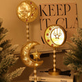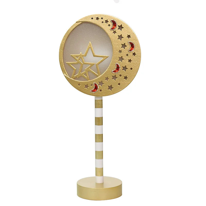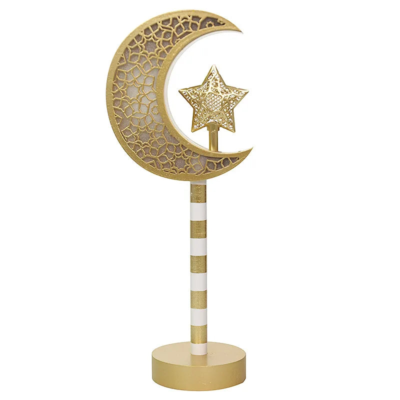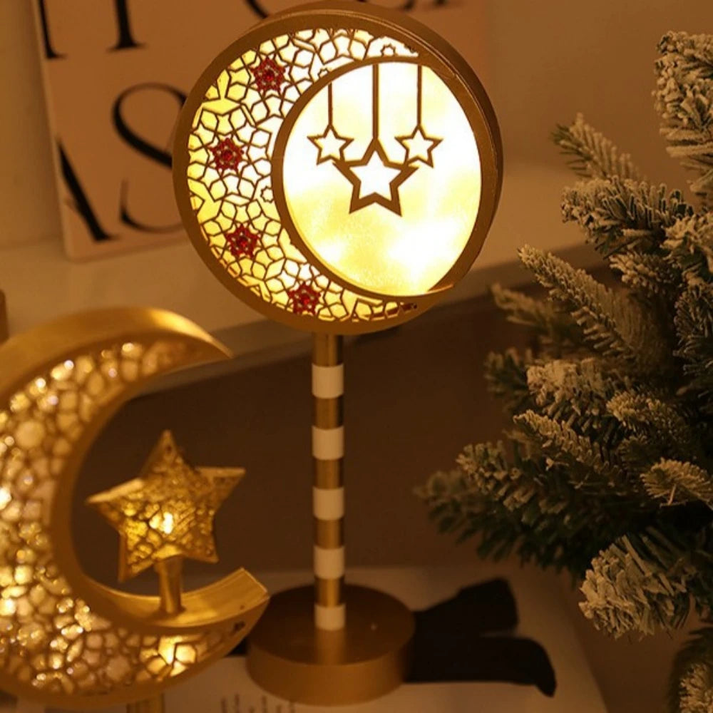 Charming wooden moon and star lamp for Ramadan and Eid Mubarak celebrations. Perfect as a table ornament or LED-lit decoration for homes, parties, and Islamic festivals.